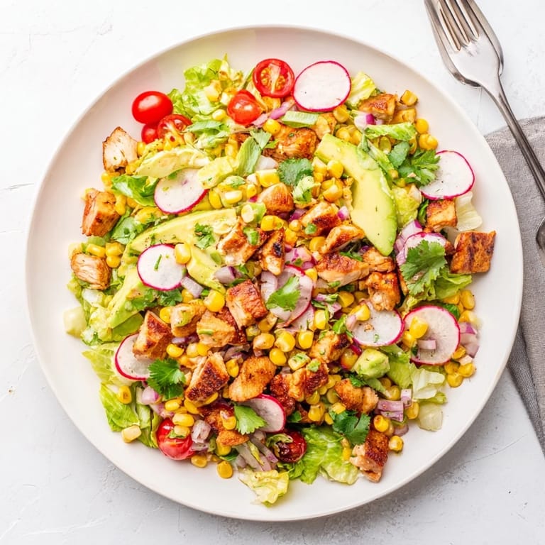 - Start with the chopped romaine as your base then arrange the grilled corn diced chicken avocado radishes cherry tomatoes and red onion on top. Drizzle that bright dressing over everything and toss it all together gently.