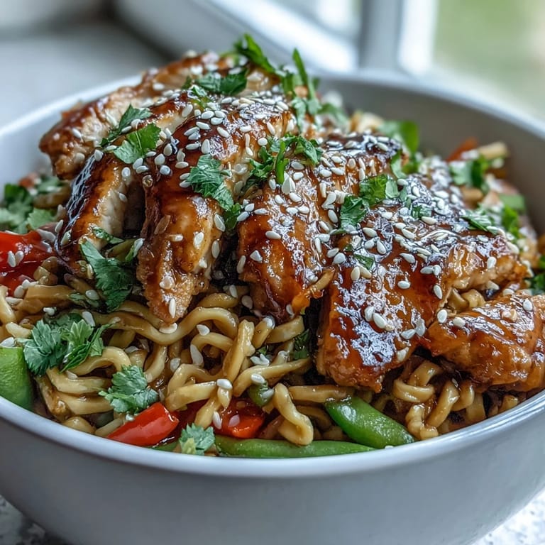 Save to Pinterest There's something about the sizzle of chicken hitting a hot wok that makes you feel like you're cooking something special, even on a Tuesday night when you're not trying that hard. I stumbled onto this sesame chicken noodle bowl while rummaging through my pantry one evening, realizing I had everything except an excuse not to make dinner. The magic happens when that glossy, ginger-forward sauce coats warm noodles and tender chicken, and suddenly your kitchen smells like a place you'd actually want to linger. It became the bowl I crave when I want something that tastes impressive but doesn't demand hours of my time.