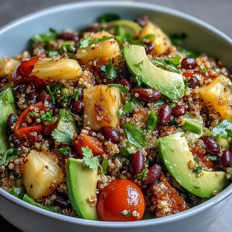 Save to Pinterest Transport yourself to a tropical paradise with each forkful of this vibrant Tropical Quinoa Salad. The nutty quinoa provides the perfect canvas for sweet juicy pineapple chunks, hearty black beans, and a rainbow of fresh vegetables. This salad is a celebration of textures and flavors that dance together in perfect harmony - from the subtle crunch of red bell peppers to the creamy richness of avocado, all brightened by a zesty lime dressing that ties everything together.