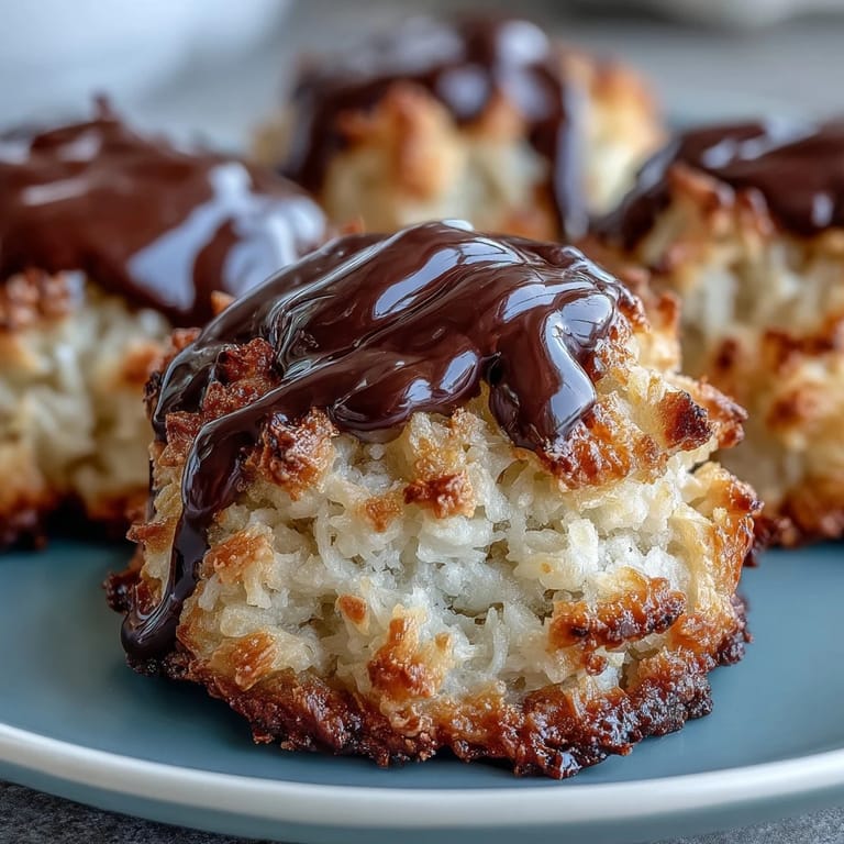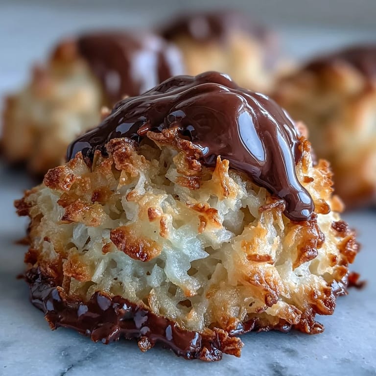Save to Pinterest My cousin called me one afternoon asking if I could bring something to her dinner party, and she casually mentioned she'd gone vegan. I stood in my kitchen thinking about what dessert could possibly work without eggs or butter, and then it hit me—coconut macaroons. They're naturally forgiving, need just a handful of ingredients, and the chocolate drizzle on top makes them look far more impressive than they actually are.